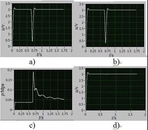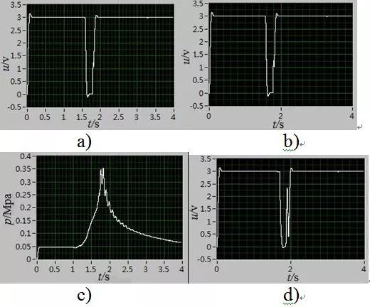 圖4為第二次阻火試驗(yàn)測(cè)試信號(hào)圖,由圖中a)、b)數(shù)據(jù)可以計(jì)算出此次火焰到達(dá)測(cè)試點(diǎn)處的火焰速度為133m/s,由d)可知該處火焰?zhèn)鞲衅魈綔y(cè)到火焰存在,證明阻火器阻火失效。由圖4中c)可知火焰到達(dá)測(cè)試點(diǎn)處的最大爆炸壓力為0.36MPa。